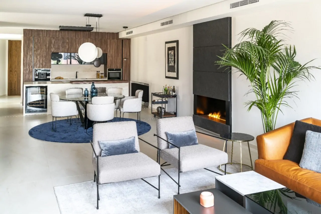 Obok wyspy, w tej samej otwartej przestrzeni, znajduje się jadalnia i salon, który z kolei łączy się z jednym z tarasów. Dominują tu neutralne odcienie: szarości, błękity i biele z drobnymi akcentami w ciemnych tonacjach, jak wspomniane drewno czy mebel-kominek ze spieku Dekton Eter, który definiuje całe otoczenie. „Pracowaliśmy zarówno z powierzchnią Silestone, jak i Dekton, stosując je na podłodze, w łazienkach i na blatach. Użyliśmy ich do unikalnych elementów, stworzonych na ich miarę, takich jak sam kominek, czy donice zewnętrzne. Cosentino stworzyło materiały o niemal nieskończonych możliwościach” – dodają architekci.