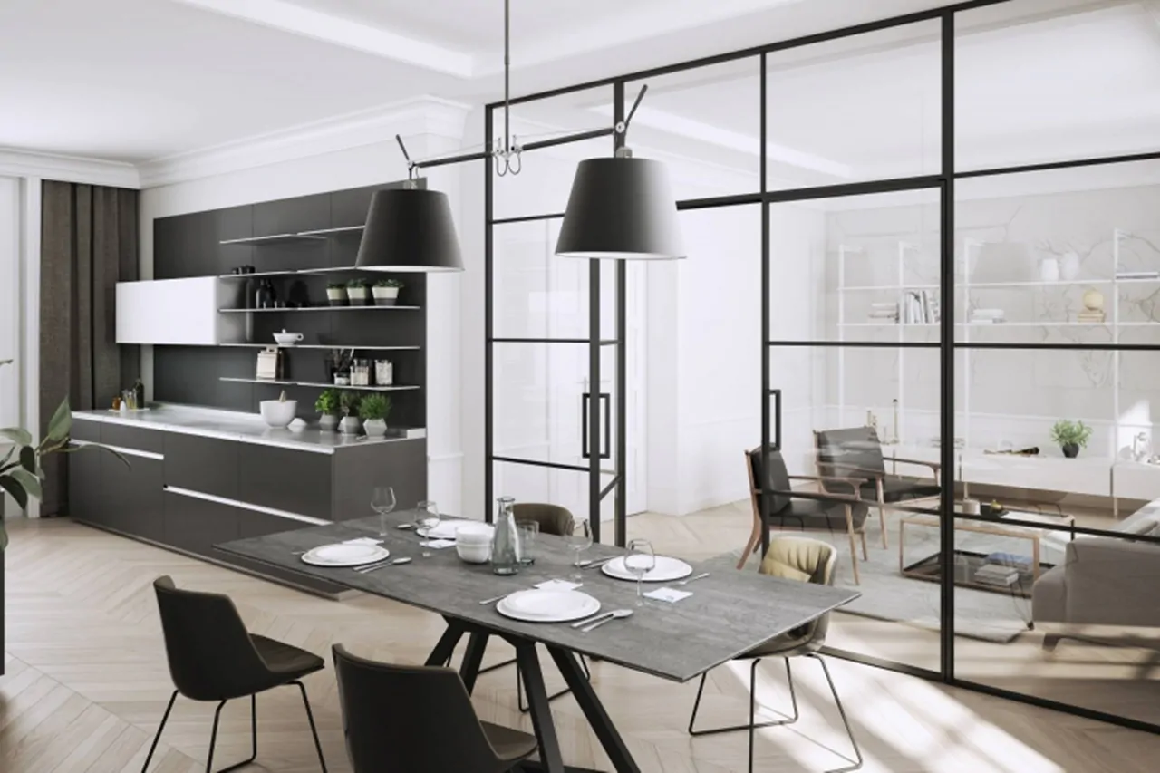 Świetnym przykładem może być strefa dzienna urządzona w kamienicy w stylu paryskim, gdzie kuchnię i jadalnię od salonu wydziela przezierna ściana działowa w systemie Lumi z drzwiami uchylnymi. Wysoka ścianka z symetrycznie ułożonymi, czarnymi szprosami z jednej strony stanowi przeciwwagę dla stylu kamienicznego. Z drugiej: dobrze koresponduje z modną sztukaterią i parkietem ułożonym w jodełkę. Dzięki temu wnętrze jest eleganckie, wysmakowane, ale jednocześnie niezobowiązujące.