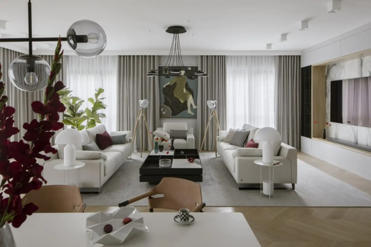 Apartament został zaprojektowany dla pięciu osób – gospodarzy oraz trojga ich dzieci, z założeniem, że kiedy w niedalekiej przyszłości młodzi rozpoczną studia, wyprowadzą się, a ich pokoje będą pełnić funkcję przestrzeni dla gości lub gabinetu. Dlatego również te pomieszczenia doskonale wpisują się w klimat całego apartamentu, próżno szukać tu odstępstw od przyjętej stylistyki. Układ funkcjonalny mieszkania zapewnia prywatność wszystkim domownikom, ale daje też wspaniałe możliwości wspólnego spędzania czasu w przestronnej części dziennej. Do apartamentu wchodzi się z centralnie położonej klatki schodowej do wygodnego, przestronnego przedpokoju z dużym lustrem, praktyczną ławką oraz pojemną garderobą. Obok swoją przestrzeń ma najstarsza córka inwestorów – znajduje się tu jej pokój, z którym sąsiaduje prywatna łazienka. Hol wejściowy prowadzi do dużej, otwartej przestrzeni dziennej o powierzchni ponad 60 m kw. Strefa wypoczynkowa umożliwia wspólny relaks wszystkim domownikom i ich gościom – stanęły tu dwie wygodne sofy i fotel. Przestrzeń, dzięki czterem dużym oknom na dwóch ścianach jest wypełniona naturalnym światłem, delikatnie przytłumionym przez dodające przytulności firany i zasłony. Trzecia ściana została przeznaczona na zaprojektowaną na wymiar zabudowę z telewizorem. Symetryczne ustawienie mebli wprowadza wizualny porządek i harmonię. Obok znajduje się strefa jadalniana, w której stanął nowoczesny w formie stół z ośmioma krzesłami oraz przeszklona witryna na zastawę stołową, także zaprojektowana na wymiar (doskonale wypełniła wnękę obok wystającego i zaburzającego przestrzeń pionu wentylacyjnego).