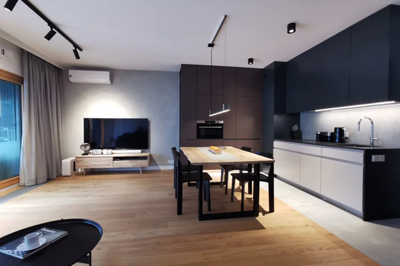W tak ważnej tu sztuce kreowania przestrzeni rzeczą nie do przecenienia jest światło – zarówno naturalne, jak i sztuczne. To drugie wprowadzają w części dziennej liczne punkty świetlne. W salonie pierwszoplanową rolę grają reflektory na szynoprzewodzie. – Są bardzo wygodne w użytkowaniu. Można je swobodnie przesuwać i dowolnie kierować, a także bez remontu i bez dużych wydatków zwiększyć ich liczbę – podkreśla architekt. Temu tak plastycznemu zestawowi lamp towarzyszy m.in. loftowa świetlówka nad blatem stołu jadalnianego, a w strefie kuchni – tuby na suficie (zaakcentowane we wnętrzu czarnym kolorem opraw) i dyskretne podszafkowe taśmy ledowe, które oświetlają blat – wykonany z kamienia, a więc zgodnie z życzeniem inwestora niezwykle trwały.